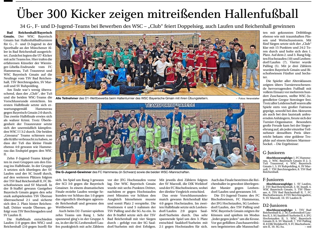 In einer unterhaltsamen Begegnung drehte die C2 Jugend (SG) Laufen/Leobendorf II (9) o.W. einen frühen Rückstand und besiegte die DJK Weildorf (9) deutlich mit 4:1.Die Gäste aus Weildorf erwischten den besseren Start und gingen in der 17. Minute durch Simon Unterrainer mit 1:0 in Führung. Die Spielgemeinschaft zeigte sich jedoch unbeeindruckt und glich noch vor der Pause in der 29. Minute aus, ehe sie die Partie in der 40. Minute mit dem Treffer zum 2:1 komplett drehte. Auch nach dem Seitenwechsel blieben die Hausherren spielbestimmend und schraubten das Ergebnis durch Tore in der 50. und 62. Minute zum verdienten Endstand in die Höhe. Interessanterweise wird die (SG) Laufen/Leobendorf II trotz dieses deutlichen Erfolgs in der Tabelle weiterhin auf dem neunten Platz ohne Punkte geführt, was auf den Status „o.W.“ (ohne Wertung) hindeutet, während die DJK Weildorf nach ihrem ersten Saisonspiel vorerst Rang zwei belegt.