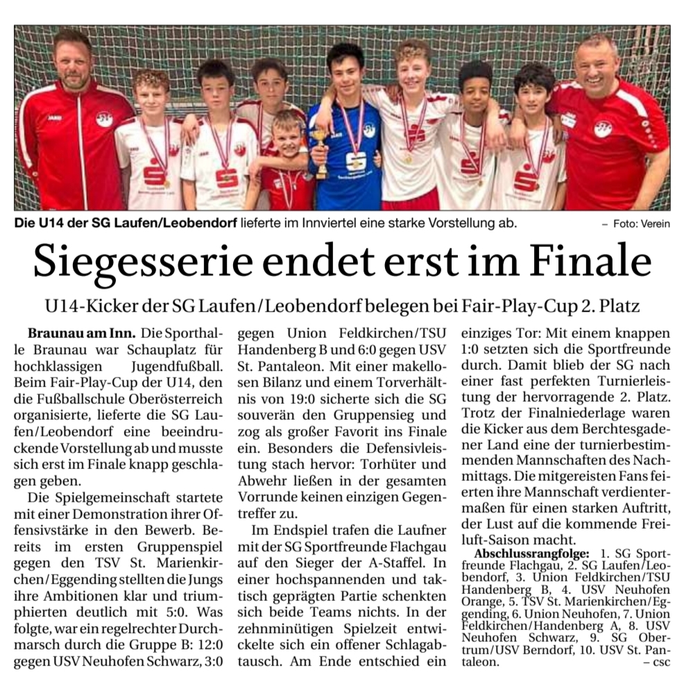 Weniger Fortune hatten die Teams am Samstag, welche knappe Testniederlagen hinnehmen mussten. Die A-Junioren waren am Samstag beim TSV Fridolfing zu Gast und unterlagen mit 3:4 Toren. Vor 50 Zuschauern sorgte Elias Kronbichler nach neun Minuten für die Heimführung. Der Ausgleich in der 21. Minute wurde durch Jason Reschberger zum 2:1 in der 47. Minute zunichte gemacht. Laufen/Leobendorf gelang jedoch in der 50. Minute der abermalige Ausgleichstreffer. Die Laufener und Leobendorfer konnten in der 69. Minute sogar in Führung gehen, bevor der Hausherr zum "Endschlag" ansetzte und durch Elias Kronbichler (76.) und Samuel Stadler (90.) den Testsieg erwirkten.