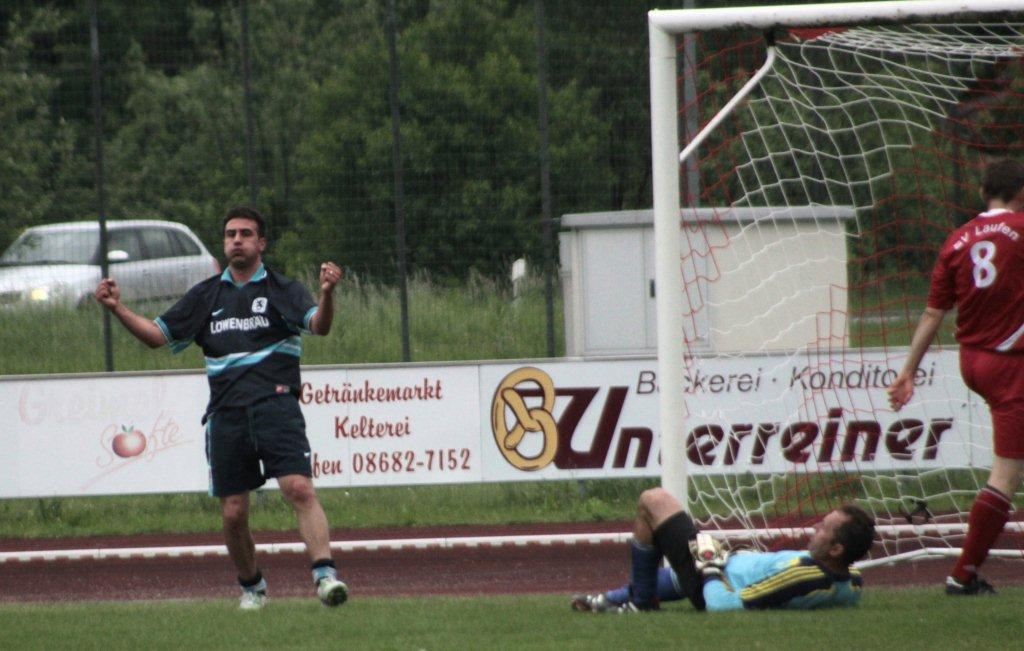 Paul Agostino feiert letztjährige in bewährter Manier seinen 1:0 Führungstreffer. Links der Ex-Löwenprofi neben dem geschlagenen AH-Keeper Rudi Reimann.