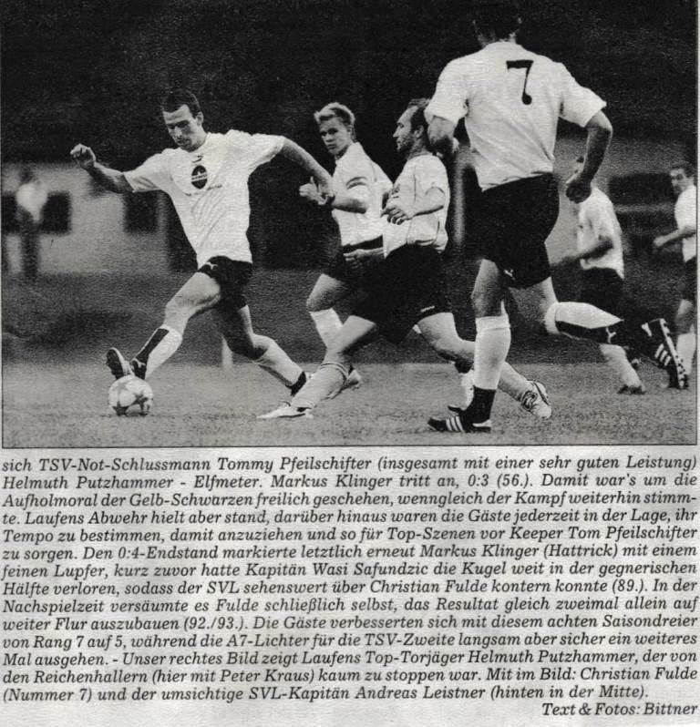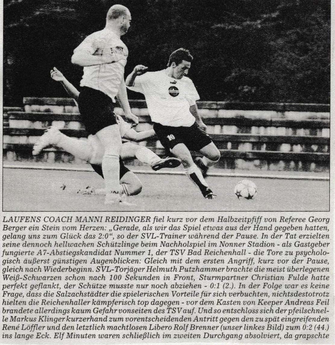 Der achte Saisondreier gelang dem SV Laufen in der Saison 2006/2007 im Nonner Stadion in Bad Reichenhall. Viermal netzten die Schützlinge von Trainer Manfred Reidinger im Nachholspiel am Mittwochabend, den 25. April 2007 in der Kurstadt ein. Die Torschützen des SVL waren damals 2mal Markus Klinger, Helmuth Putzhammer und Christian Fulde.