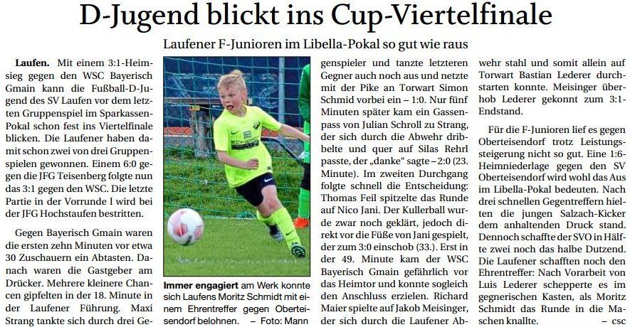 Die C-Junioren der SG Laufen/Leobendorf empfingen am 22. April 2016, also genau vor 4 Jahren, den FC Hammerau. Das Spiel in der Kreisklasse Ruperti endete vor 20 Zuschauern auf dem Sportgelände in Laufen mit einem 3:0 Heimsieg der SG Laufen/Leobendorf.