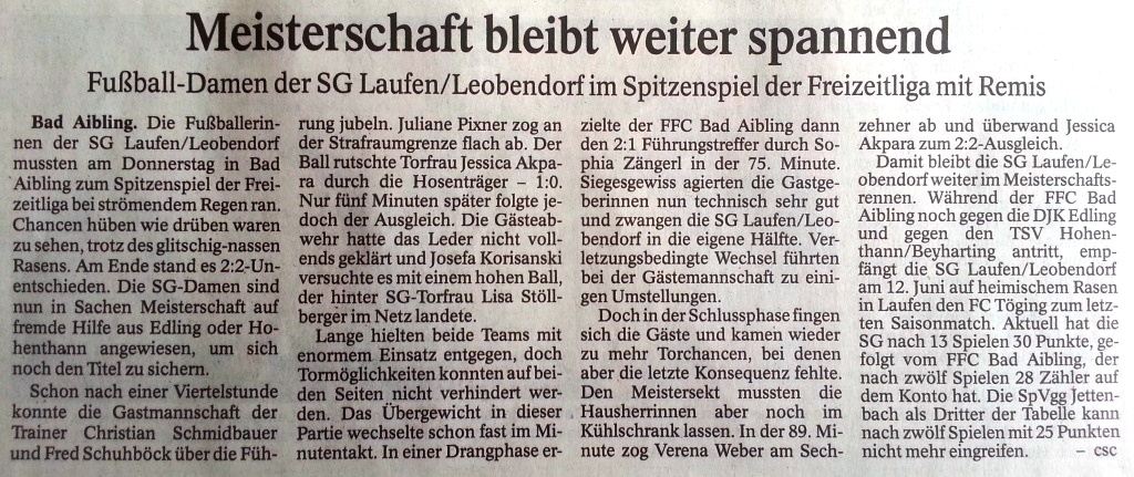 Die Damen der SG Leobendorf/Laufen reisten am 28. Mai 2016, also genau vor 4 Jahren, zur DJK Edling. Das Spiel in der Freizeitliga Gruppe 1 endete auf dem Sportplatz in Edling mit einem 2:0 Auswärtssieg der SG Leobendorf/Laufen.