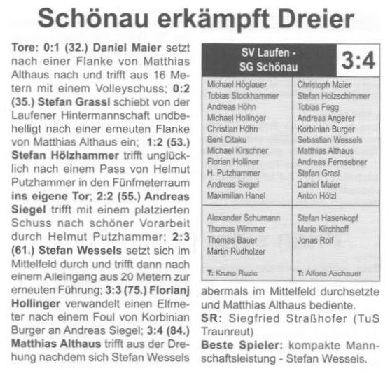0:1 Daniel Maier (32.), 0:2 Stefan Grassl (35.), 1:2 Stefan Hölzhammer (53., Eigentor), 2:2 Andreas Siegel (55.), 2:3 Stefan Wessels (61.), 3:3 Florian Hollinger (75., Elfmeter) und 3:4 Matthias Althaus (84.).