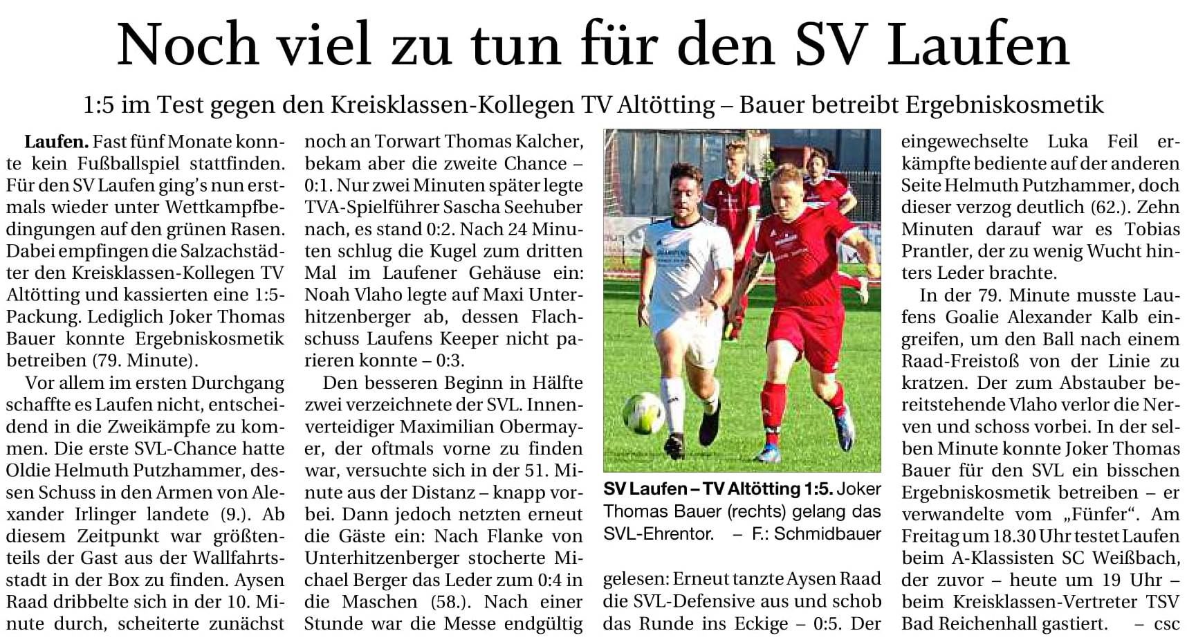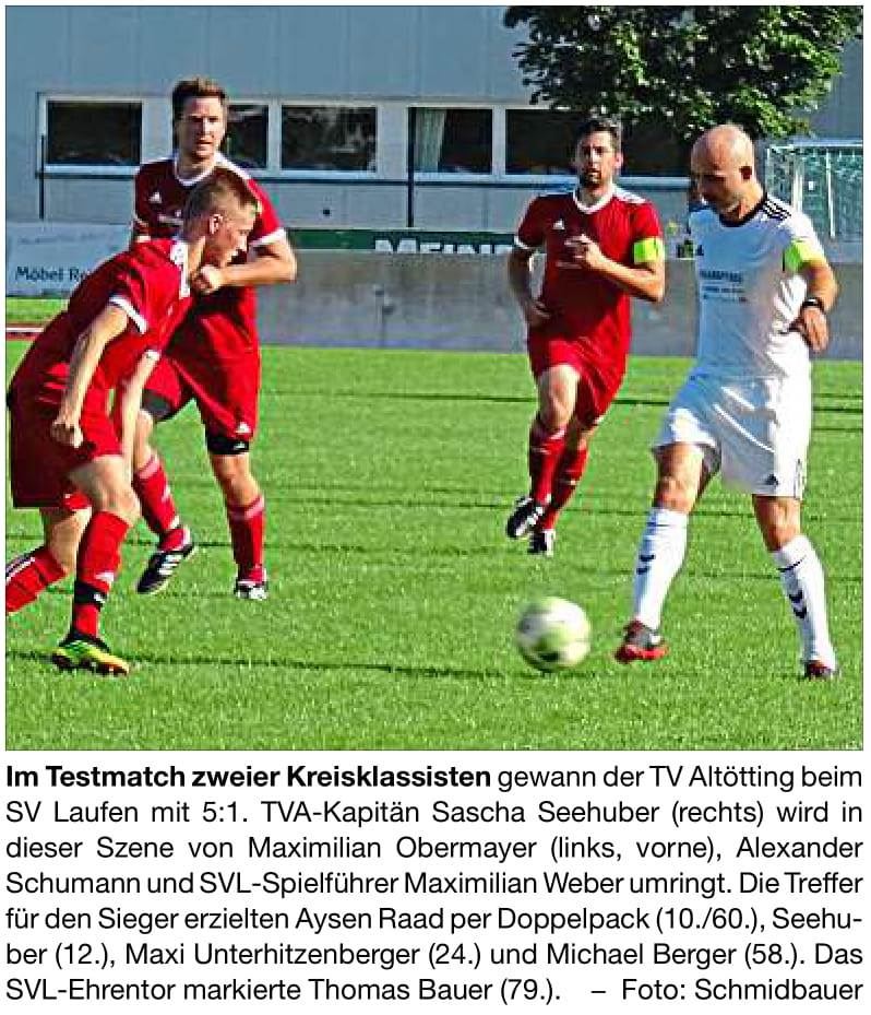 In der 8. Spielminute eröffnete Maximilian Schmidt das Match im Stadion an der Freilassinger Straße mit Laufens Führung. Tobias Antosch zog zuvor von rechts kommend an der Strafraumgrenze entlang und steckte auf Schmidt durch. Schmidt scheiterte zuerst am gut aufgelegten Gästekeeper Georg Huber, doch im Nachsetzen konnte Schmidt das Runde noch im Tor unterbringen – 1:0. Zwei Minuten nach Laufens Führung wurde der Gast aus Taching durch eine Standard gefährlich. Ein Eckstoß flog ziemlich unbehelligt auf Sebastian Wamsler, der aber sowohl an der ablenkenden Fußabwehr von Torwart Alexander Kalb als auch an Alexander Schumann scheiterte. Schumann knallte das Leder vor der Torlinie aus der Gefahrenzone weg. Dies war aber nur ein Intermezzo in Tachings Offensivbemühungen. Laufen bestimmte das Spiel in weiten Teilen. Nach über zwanzig Minuten wurde es im Tachinger Strafraum wieder hoch interessant. Sebastian Hempfer hatte bei seinem Schuss noch zu viel Kraft im Schlappen und verfehlte den Einschuss deutlich. Ein schöner Spielzug in der 26. Minute sorgte dann aber für einen weiteren Treffer der Hausherren. Der Ball zirkulierte gut durchs Laufener Mittelfeld. Maximilian Schmidt stach in der Folge in den Strafraum und legte quer in den Fünfmeterraum ab. Dort verfehlten Fatos Krasniqi und Tobias Antosch, die sich selbst behinderten, doch im Hintergrund stand Sebastian Hempfer bereit, der den schönen Spielzug zum 2:0 vollendete. In Minute 39 hätte es eigentlich schon 3:0 für Laufen stehen können, doch Tobias Antosch und zweimal Sebastian Hempfer scheiterten in kurzer Folge an Tachings Keeper.