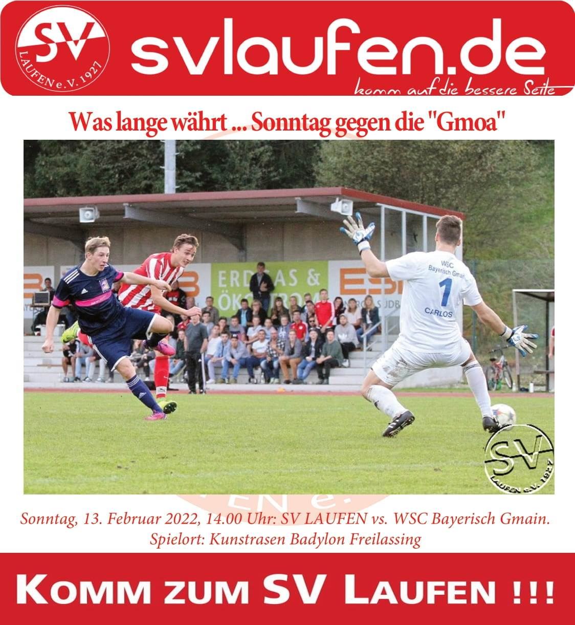 Laufen/Freilassing: Fast könnte man es als einen Kraftakt bezeichnen, was die beiden Abteilungsleiter Färbinger (Bayerisch Gmain) und Schmidbauer (Laufen) so in den letzten Monaten hinlegten. Nach Verschiebungen, Absagen, Corona und/oder sonstigen Unwägbarkeiten zu diesem Spiel, ist es nun am Sonntag endlich soweit. Der SV Laufen kann gegen den WSC Bayerisch Gmain testen. Austragungsort ist der Kunstrasen im Badylon-Sportpark in Freilassing. Anpfiff um 14 Uhr zur besten Fußballzeit.