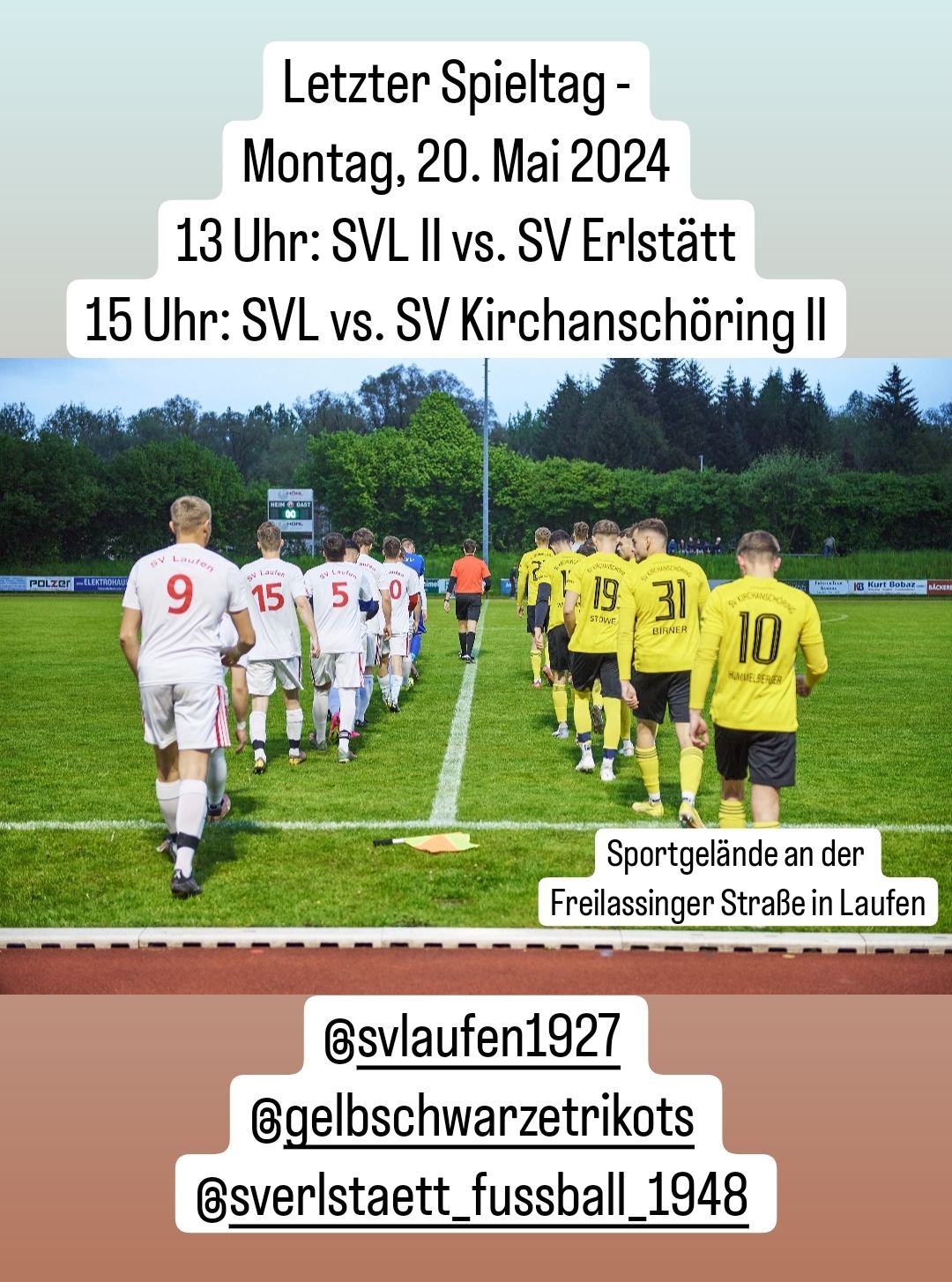 Ihr könnt uns jederzeit eure Bilder zukommen lassen, wo ihr den SV Laufen präsentiert. Entweder per Mail unter Diese E-Mail-Adresse ist vor Spambots geschützt! Zur Anzeige muss JavaScript eingeschaltet sein. oder auch in Nachrichten über unsere Social Media Kanäle Facebook und Instagram. Wir freuen uns schon darauf und wünschen euch allen schöne Urlaubstage in Pfingst- und/oder Sommerferien.
