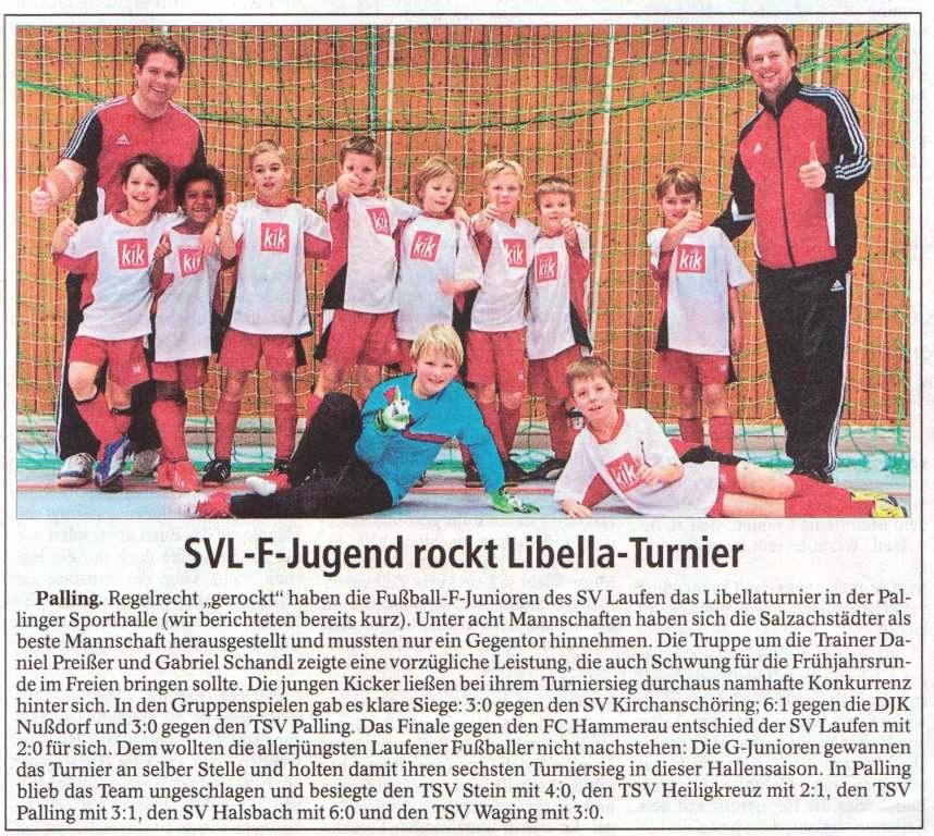 Einzig und allein die E1-Junioren des SV Laufen haben an diesem Wochenende einen Halleneinsatz. Sie gastieren am Sonntag, den 21. Januar in der Sporthalle von Mitterfelden bei einem Einladungshallenturnier des FC Hammerau. 10 Teams haben für dieses Turnier gemeldet und wurden in zwei Vorrundengruppen ausgelost. In Gruppe A: FC Hammerau, BSC Surheim, SV Leobendorf, SBC Traunstein und TSV Bad Reichenhall II. In Gruppe B: SV Surberg, UFC Hallein, TSV Bad Reichenhall I, SV Seekirchen und SV Laufen.