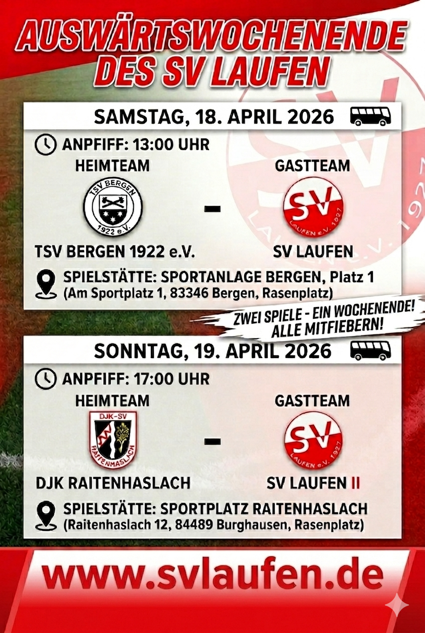 Laufen: Die Fußballschuhe sind geschnürt, die Trikots frisch gewaschen: Auf den SV Laufen und seine verschiedenen Spielgemeinschaften wartet ein Wochenende der Superlative. Vom 17. bis zum 19. April 2026 jagt ein Highlight das nächste – dabei reicht die Palette von Rückrundenstarts über nervenaufreibende Kellerduelle bis hin zu echten Bewährungsproben.