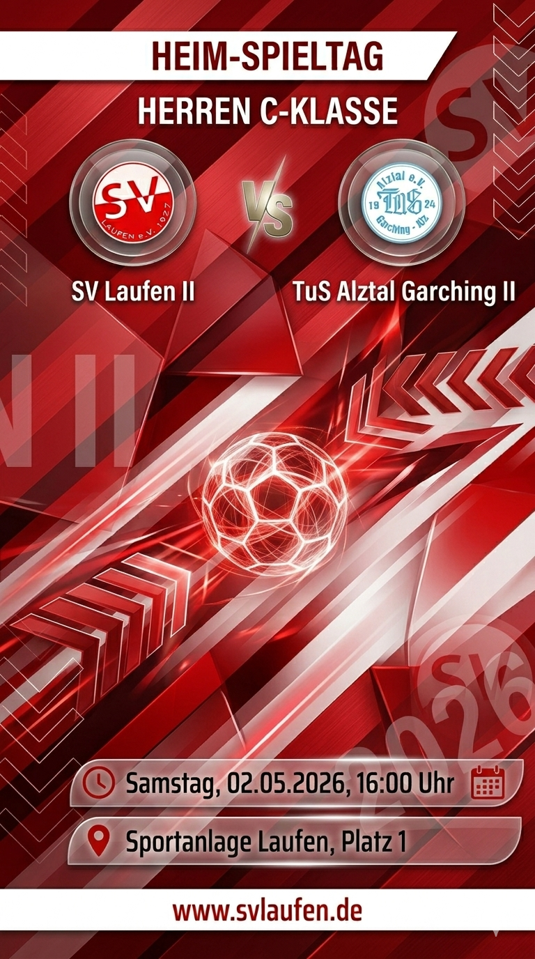 Samstag, 2. Mai 2026, 16.00 Uhr: SV Laufen II vs. TuS Alztal Garching.