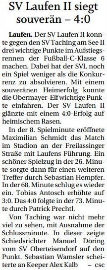 Die 2. Mannschaft des SV Laufen empfing am 28. April 2019, also genau vor 1 Jahr, den SV Taching am See II. Das Spiel in der C-Klasse 6 endete vor 50 Zuschauern auf dem Sportgelände des SV Laufen mit einem 4:0 Heimsieg des SV Laufen II.