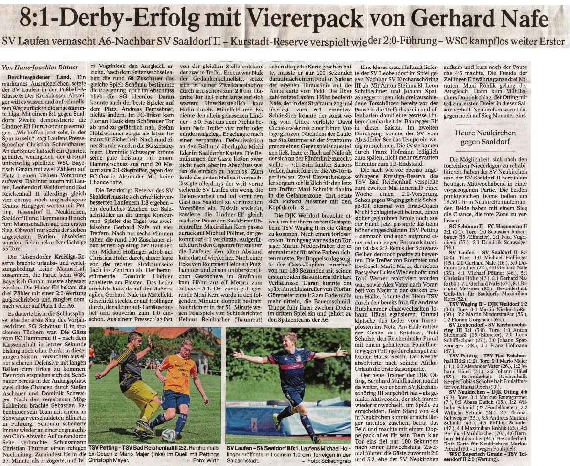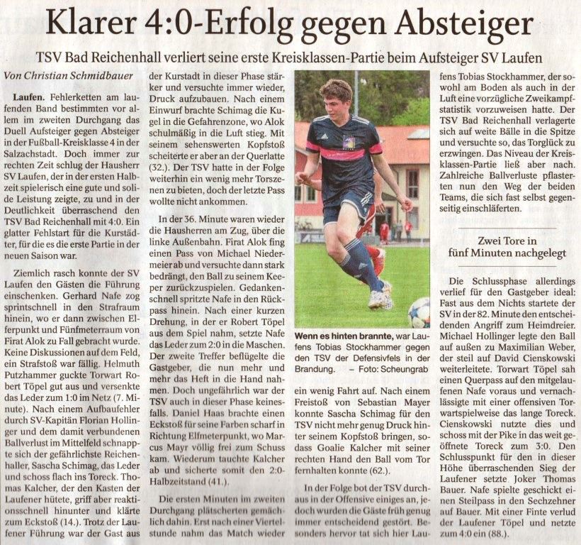 Die 1. Mannschaft des SV Laufen empfing am 13. August 2016, also genau vor 4 Jahren, den SV Saaldorf II. Das Spiel in der A-Klasse 7 endete vor 120 Zuschauern auf dem Sportgelände in Laufen mit einem 8:1 Heimsieg des SV Laufen.